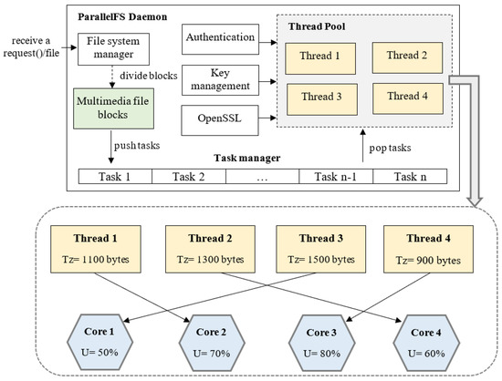 The primary goal of ParallelFS is to achieve both a higher cryptographic performance and a faster response time for each multimedia file read and write request. However, the performance level is driven by reserved processes, resource workloads, and the technological environment. Moreover, the variation in synchronization and the difference in the computation of parallel threads affect the performance of CPU cores. In a multi-core CPU, one core may be overloaded by waiting for I/O operations or entering a low-power idle state. When executing tasks that vary in size, one core may complete its process before other cores, thereby reducing the efficiency and increasing the system response time. To avoid this, in the proposed scheme, we measured the CPU utilization of threads by measuring the amount of time each thread spends executing on the core. Thread scheduling in ParallelFS is based on the completely fair scheduler (CFS) of Linux. It periodically and dynamically measures the CPU utilization of running threads such that fewer cryptographic processing tasks are assigned to heavily loaded cores, whereas larger tasks are scheduled to cores with less data processing or are in an idle state. We designed a thread pool in the ParallelFS file system daemon to perform parallel encryption tasks running on the CPU cores. Figure 3 shows the scheduling of threads on CPU cores, where Tz denotes the thread size in bytes, and U is the core utilization ratio.