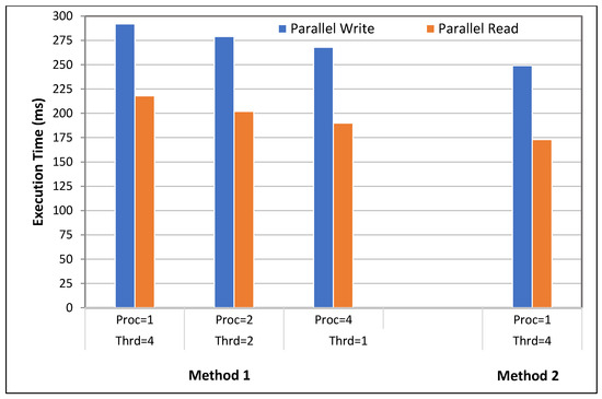 Comparison of parallel writing and reading of an 8 MB file using different numbers of processes and threads with Methods 1 and 2.