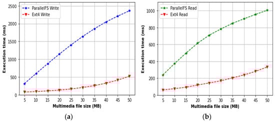 Comparison of execution times of (a) writing and (b) reading multimedia files using ParallelFS versus standard Ext4.