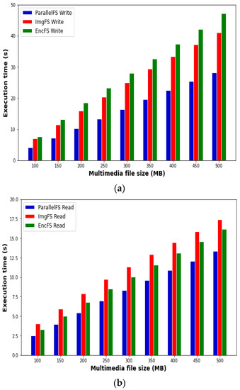 Next, we compared the performance of ParallelFS over multimedia file writes and reads with cryptographic services with normal write and read processes without encryption using the standard Ext4. We began the experiment by writing and reading a file of 5 MB and repeated the tests regularly by increasing the file size to 50 MB. In addition, we flushed the file cache for each test. Accordingly, the elapsed times for all the read and write operations were recorded. Figure 7 compares the total times measured for writing and reading multimedia files using ParallelFS and Ext4. ParallelFS can achieve average throughputs of 19.2 and 37.1 MB/s for writing and reading files, respectively, with cryptographic protections. By contrast, the average throughputs for the normal processes to write and read same-sized files using the standard Ext4 were 123.2 and 155.1 MB/s, respectively. Moreover, we calculated the execution time that elapsed during the multimedia file read and write operations in ParallelFS. These times include the time of the actual encryption and decryption operations and that of the other required file system processes performed inside the kernel and at the user level. The related write/read times of other executed processes include the time spent seeking the writing/reading blocks of file data, the I/O time spent on writing/reading data blocks into a local buffer to perform the encryption/decryption task, the workload time spent on encrypting or decrypting the symmetric keys, and time spent saving or extracting keys from the file header.
