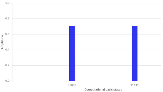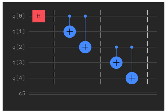 Thus, it comes as no surprise that this work also utilizes quantum entanglement in a critical manner in order to implement the proposed protocol of quantum secret aggregation. Specifically, our protocol relies on the maximally entangled n-tuples of qubits, i.e., qubits that are in the literature referred to as the state. Present-day quantum computers can produce arbitrary GHZ states using various quantum circuits. A methodology for constructing efficient such circuits is given in [46]. The resulting quantum circuits are efficient in the sense that they require steps to generate the state. One such circuit that generates the state using the IBM Quantum Composer [47] is shown in Figure 2. The dotted lines are a helpful visualization that allows us to distinguish “time slices” within which the CNOT gates are applied in parallel. Figure 3, which is also from the IBM Quantum Composer, indicates the state vector description of the state.