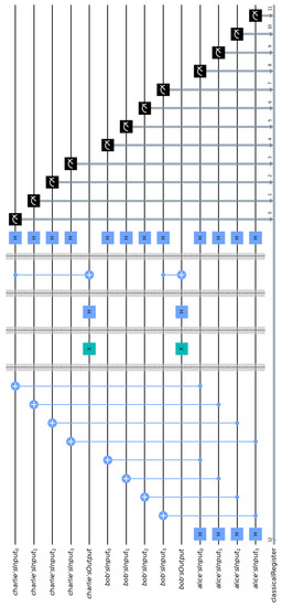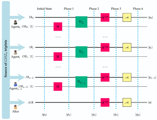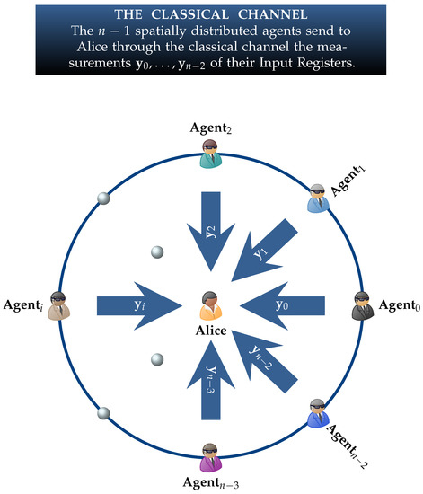In Equation (9), designates the contents of Alice’s input register, is the state of the agents’ output registers, and denotes the contents of the input registers of the agents. In what follows, the subscripts A and are utilized in an effort to distinguish between the local registers of Alice and Agent, …, Agent, respectively.