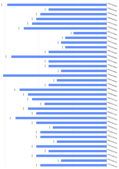 With all the above observations duly noted, we may verify that this simulation is indeed a localized version of the blueprint for the QSA protocol, as shown in Figure 6. The final measurements by Alice, Bob and Charlie will produce one of the equiprobable outcomes. Showing all these outcomes would result in an unintelligible figure so we opted for depicting only some of them in Figure 9. This figure also shows the corresponding probabilities for each outcome; it should not come as a surprise that they are not shown to be equiprobable as the theory expects since the figure resulted from a simulation run for 4096 shots. The important thing though is that every possible outcome satisfies the fundamental correlation property and verifies Equation (19). Therefore, ignoring the unlikely case that Alice measures in her input register, Bob and Charlie, after measuring their input registers and obtaining and , respectively, only have to send their measurements to Alice so that she can uncover the secret key.