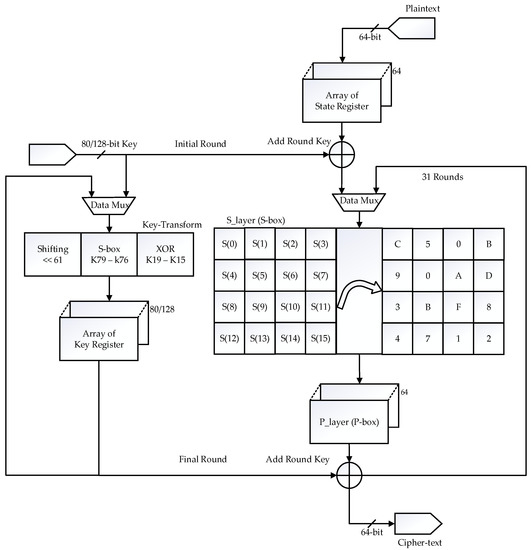 26. Lara-Nino, C.A.; Morales-Sandoval, M.; Diaz-Perez, A. Novel FPGA-based low-cost hardware architecture for the PRESENT block cipher. In Proceedings of the Euro micro-Conference on Digital System Design (DSD), Limassol, Cyprus, 31 August–2 September 2016. [Google Scholar]