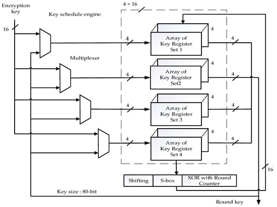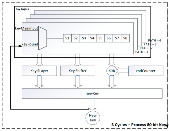 The key schedule engine’s entire 80-bit is processed in four cycles. In every cycle, 16 bits are available as round keys. Five 4-bit registers were arranged in this particular structure to form the key register. The key scheduling engine has four paths, each with one 2 × 1 multiplexer and pipelined key register. The key schedule architecture is similar to the data path architecture, where multiplexers switch the data between the round input keys in each cycle. The 80-bit output from key registers undergoes three processes: shifting, XOR with current counter value, followed by S-box and P-box shown in Figure 3. The 64-bit cipher text (output message) is obtained at the end of the process. The throughput is calculated as referred to in [27]. It is expressed in Equation (1).