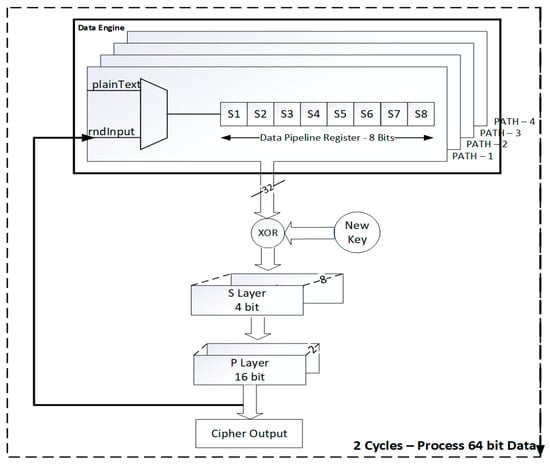 In Lara Nino et al.’s [27] work, the 64-bit plain text (input message) is provided to the data processing engine as 16-bit in four clock cycles. The data processing engine has four paths and each path consists of multiplexers and pipelined data registers, as shown in Figure 2. The multiplexer selects from either the plain text input or round data at each cycle. Each pipelined data register has four paths and consists of 4-bit registers. The 16-bit becomes available in each cycle. In the Add Round Key step, the 16-bit output from each round is XOR with the key data obtained from the key schedule engine shown in step 1. The result is then provided to a one-dimensional S-box (S-layer) given in step 2. Each 4-bit represented in S1(first hex data), S2, S3, S4 and so on. The S-box is a 4-bit substitution box, and such boxes produce 16-bit data for each round. Next, the output of the S-box is forwarded to the P-box (Player). Each P-box processes 16-bit data. Finally, the output of the P-box is looped back to the multiplexer for the next iteration. The bit position is replaced with the 16-bit position as shown in step 3.