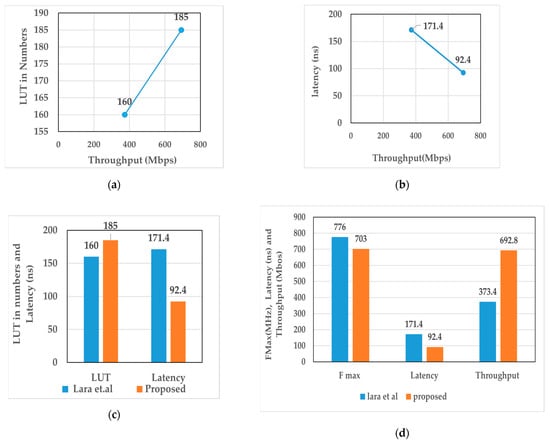 Table 1 compares Lara Nino et al.’s [27] 16-bit data path PRESENT cipher algorithm architecture versus the proposed low latency 32-bit data path architecture. Both implementations are done on the ZYNQ board 7000 [30]. The throughput of the proposed low latency 32-bit architecture increases by 85.54% compared to the 16-bit architecture. The 16-bit architecture requires five S-boxes, two P-boxes, and 133 clock cycles to complete the 31-round process. The proposed architecture requires two P-box, nine S-boxes, and 65 clock cycles to complete the 31-round process. In particular, two cycles are used to process the 32-bit input data in each round for the proposed architecture, resulting in a low latency, which makes the computing speed twice that of Lara Nino et al.’s [27] architecture. The proposed 32-bit architecture increase in throughput would allow IoT with time-constraint applications to perform better. The throughput* is calculated for the frequency of 13.56 MHz. The trade-off between the speed, latency, and resource utilization with the proposed low latency 32-bit architecture versus the Lara Nino et al. [27] architecture is shown in Figure 6. The output and test vector are depicted in Table 1 and Table 2. Power utilization is the limitation of the proposed architecture. The main focus of the proposed architecture is increasing the throughput by reducing the latency. Therefore, resource and power utilization are getting compromised and the same optimized architecture can be extended for the power analysis in future work [32,33].