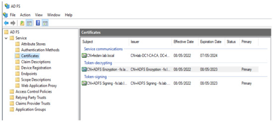 The first virtual machine is a Windows server 2019, with the domain controller (DC) and Certification Authority (CA) roles installed. The DC role acts as the identity provider for users and devices to authenticate and access resources, and the CA will issue, validate, and revoke any user or device certificate requests. An example of issued certificates can be seen in Figure 3, and the enrollment agent certificate can be seen that has been requested by the service account used by ADFS. The WHFB authentication certificate is issued to the user after successful enrolment. The WHFB Enrollment Agent certificate is used by ADFS during the provisioning to validate the public key with the one stored on the device in the Active Directory.