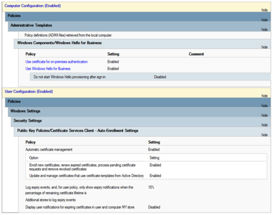 Group policy is used to enable device registration and get the correct certificate before the provisioning of WHFB (see Figure 7). The group policy is created on the first VM that holds the DC role and is applied to a group of users; otherwise, the policy will be applied to all the devices.
