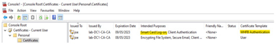 The third VM is the end-user device. Figure 8 shows the certificates under the end-user profile. The WHFB Authentication certificate template is configured to only issue certificates to certificate requests that have been signed with an enrolment agent certificate.