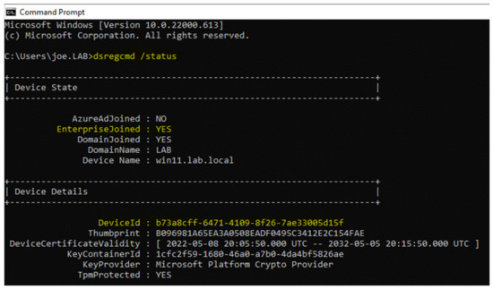 Device registration can be verified through the Active Directory by the device ID (see Figure 10) or by running the command “dsregcmd /status” (see Figure 11), which displays the same device ID as the one in the active directory of the domain controller and that the device is protected by the TPM.
