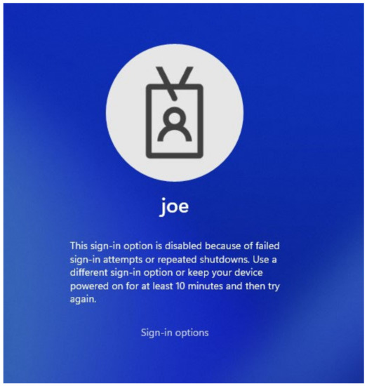 The script will attempt to use the PIN between 000000 and 999999, and when the correct PIN is located, it stops. While the script functions properly, Windows does not provide a method to change the failed attempts number, and this results in the PIN being disabled, as shown in Figure 19.