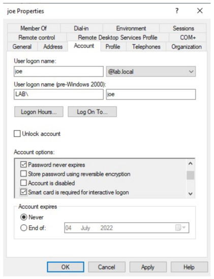 The use of a smart card for interactive logon, as seen in Figure 21, is enforced on the user from the active directory, and a group policy will be applied to the computers to exclude password authentication from the credential providers and prevent end-users from signing in with a password on the Windows login screen. This will be the fourth phase of the deployment of WHFB.