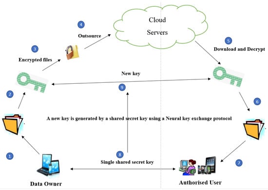 - Data owners and authorized users share a single secret key. On both sides, a new key is generated for encryption/decryption using the neural key exchange protocol. The user can be an owner as well (detailed in the proposed system architecture: steps 8 and 9).