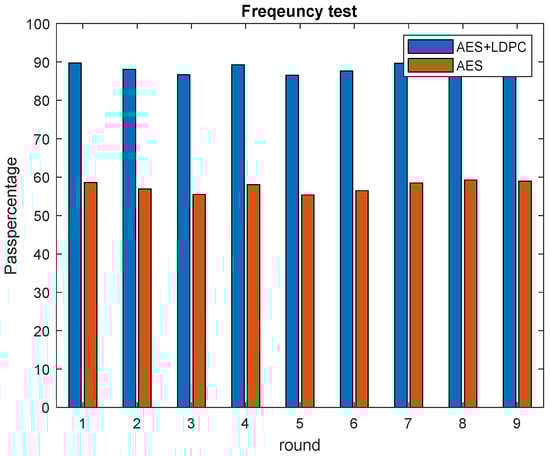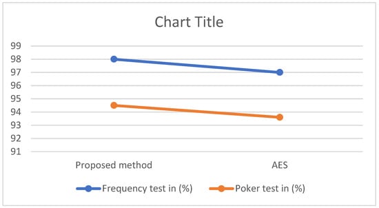 The threshold level is set at 10%, which means that 10 out of 100 sequences generated by Equation (15) can be rejected i.e., minimum of 90% of the sequence should pass the test. The results tabulated in Table 4 suggest that the proposed techniques successfully pass the BUCT test, as the randomness factor is 98% and 94.5% of sequences pass the poker test. Figure 6 shows the plot that helps us to understand the behavior of the proposed method and AES-128 for the BUCT test. The proposed SARNC technique has a higher pass percentage compared to AES-128.