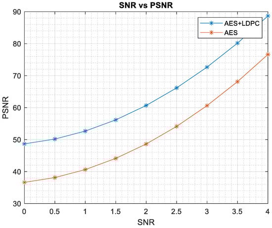 In their work, Mona F. M. Mursi et al. [] combined hybrid chaotic encryption with LDPC. The image is transformed by applying FRFT and then encrypted using an Arnold cat map for confusion and a Hénon map for diffusion. This encrypted image is encoded using LDPC coding. In this paper, the analysis of results is carried out only concerning BER, FER, and PSNR. Emphasis is not given to analyzing the security aspect of the proposed algorithm.