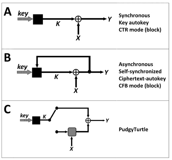 Stream cipher modes. Diagrams (left) and terminology (right) for various stream-cipher encryption modes. X and Y represent plaintext and ciphertext; the black boxes represent a keystream generator, which produces keystream K from some initial state (key); and the gray box is an error-correcting code. (A) The synchronous mode follows the simple rule that . (B) In the asynchronous mode, the keystream generator’s state includes feedback from some previous ciphertext. (C) PudgyTurtle mode utilizes the keystream in two different ways. When the toggle is down, K is used to encode a multibit plaintext ’symbol’. When the toggle is up (shown here), a different portion of K is XOR’ed with this codeword to encipher it. The toggle remains in the down position for a variable duration so that the total amount of K required to encrypt varies from symbol to symbol.