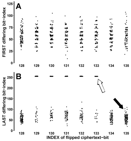 Can the attacker predict which bit to target in order to have the bank accept the transaction? The results suggest not. Figure 10B shows histograms of which ciphertext symbol contained the flipped bit, both for meaningful decryptions (black bars, ▪) and for rejected attacks or nonsense decryptions (gray bars,