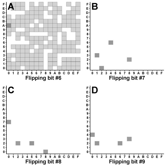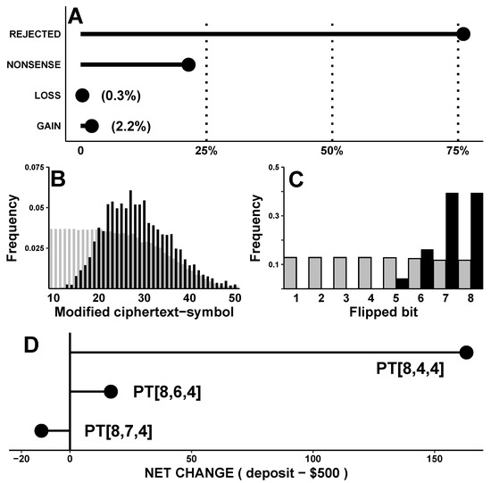 ). Although these two histograms have different shapes, they overlap significantly. Thus, targeting symbols that occur early or late in the ciphertext is suboptimal: these symbols coincide with low-probability tails of the black (’meaningful’) histogram. Yet, targeting the remaining ciphertext symbols near the peak of the black curve is also not ideal: their positions fall along the plateau of the gray (’nonsense/rejected’) histogram. Therefore, such attacks are equally likely to fail as attacks against early ciphertext symbols.Figure 10C shows similar information about which bit (within any 8-bit ciphertext-symbol) was flipped. While FLIP-D attacks against the two final bits of any codeword seems like the best strategy, such attacks still have a similar probability of REJECTED/NONSENSE outcomes as do attacks against the other six bits.