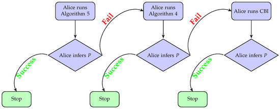 In order to reduce the number of queries to Bob, we recommend first running Algorithm 5 and, if it fails, Algorithm 4. In the improbable case of obtaining the incorrect polynomial, two strategies can be used by Alice: either change a and try again or use a classical bivariate interpolation algorithm (e.g., []). A graphical representation of the recommended process is provided in Figure 2, where CBI denotes a classical bivariate interpolation algorithm.