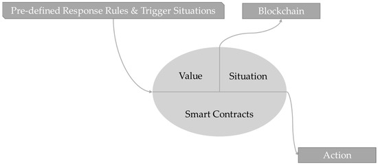 Computer protocols known as “smart contracts” allow for the informational distribution, validation, and enforcement of contracts [35]. Smart contracts do not need the verification of a third party, and successful transactions are irrevocable and traceable. Computer software is used to create a legally binding contract that can be automatically executed. A smart contract is a program placed on the blockchain that guarantees the safety and security of transactions in the absence of third-party monitoring [36]. The process of smart contracts is shown in Figure 1. In the smart contract code, predefined response rules and trigger situations are encoded, triggering specific actions automatically when predetermined conditions are met. This eliminates the need for intermediaries and improves the contract execution process’s transparency, security, and efficiency. When trigger situations, such as specific dates, events, or conditions, occur, the smart contract implements predefined actions, such as transferring ownership, releasing funds, and updating records. By incorporating blockchain technology into smart contracts, participants gain an increased trust, lower costs, and reduced fraud risks. Combining blockchain technology and smart-contract streamline processes optimizes contract administration and provides a secure and transparent solution for a variety of industries. Table 1 displays the highlights of blockchain-enabled smart contracts.