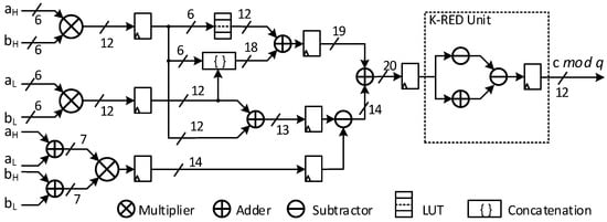 The K-DSP performs modular multiplication of two 12-bit coefficients, and , to produce a 12-bit result on the ring . The proposed architecture of K-DSP is shown in Figure 1 with three computational stages. In the initial stage, we employ the Karatsuba algorithm to partition a 12-bit multiplication operation into three discrete components: two 6-bit multiplications and one 7-bit multiplication, respectively , , and . Subsequently, the summation of these partial products is calculated using the look-up table method. As a result of this procedure, the bit-width of the product is reduced from 24 bits to 20 bits. Finally, the K-RED method is utilized to ascertain the modulus q of the 20-bit product.