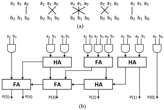 The choice of multiplier design significantly impacts the speed and area of the proposed DSP. This study selects the Vedic multiplier based on the Vertical and Crosswise technique for designing 6-bit and 7-bit multipliers due to its shorter critical path than the conventional array multipliers [38]. Vedic multipliers are performed in parallel, and the partial products are added together by two or three levels of the adder [39]. Figure 2 shows the 3-bit multiplier architecture of two numbers and . The architecture comprises nine AND gates, three full adders, and three half adders.