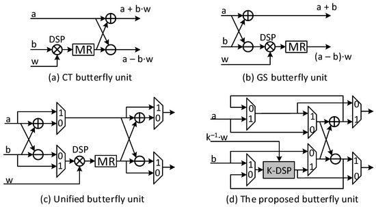 In studies [43,44], the multipliers can be merged with NTT and INTT processes. These methods involve separate butterfly operations: CT for NTT with and GS for INTT with . The unified-BU architecture has been proposed for the simultaneous computation of GS and CT in the study [14], as shown in Figure 4c. In the GS calculation, the factor can be pre-computed with the twiddle factor for the operation. With the operation , in study [45], Zhang et al. proposed replacing the multiplication by after INTT with the multiplication by in each butterfly operand, respectively . The hardware architecture for multiplier in is achieved simply by implementing .