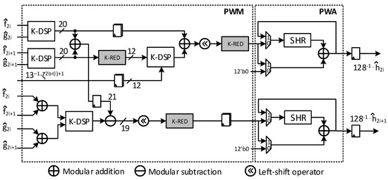 The prime parameter in Kyber is , where the factor values are k = 13 and m = 8. The elimination of accumulation is handled differently by implementing K-DSP in each BU or PWM unit. Consequently, the K-RED-based modular reduction part can be regarded as a specialized sub-module, which will be further discussed in the following sub-sections.
