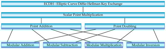 ECDH and ECC algorithms. The ECDH key exchange invokes a scalar point multiplication that uses two computations—point addition and point doubling. Four primitive modular calculations (addition, subtraction, multiplication, and inversion) are used for these two computations.