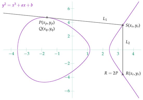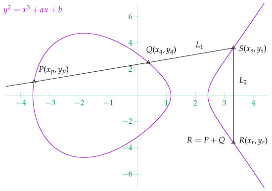 Figure 2 shows the point addition on an elliptic curve . Given two distinct points and on the curve, if the line through P and Q intersects the curve in , then is defined as and . Because , the line through S and R is a vertical line.