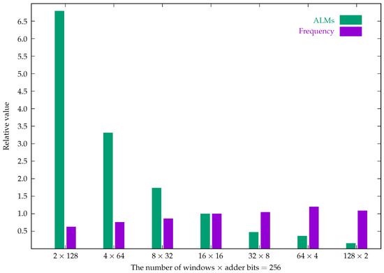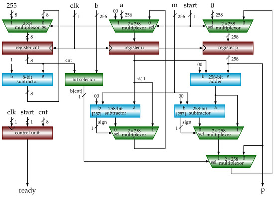 Point addition and point doubling operations consist of many modular multiplications, especially in projective and Jacobian coordinates. Accelerating modular multiplication is therefore important for high-performance ECC. The interleaved modular multiplication (IMM) algorithm [6] eliminates the need for division and has a lower hardware cost. To calculate with , IMM first calculates , where is the ith bit of b. To guarantee , we can subtract at most from p since . To carry this out, the traditional IMM algorithm performs the following calculation twice sequentially: if , . The work in [7] is an FPGA implementation of a processor for elliptic curve point multiplication over prime fields. It uses a modified IMM algorithm with a three-input multiplexer to select one from p, , and . Also, it uses a multiplexer to select one from and for where is used as the multiplexer selection signal. The design in [8] is similar to [7], but uses two-input “AND” gates to implement so that it will perform if is 0, and otherwise. The work in [9] is a low hardware consumption elliptic curve cryptographic architecture over prime fields for embedded applications. It performs and uses a four-input multiplexer to select one from 0, , , and , for 0, 1, 2, and 3, respectively. In fact, a three-input multiplexer is sufficient because and hence . The authors in [10] present an ECC architecture that adopts the modular multiplication algorithm proposed in [9]. The design in [11] implements an ECC processor over the NIST [5] prime fields. It uses two subtractors to prepare and and then uses a three-input multiplexer to select one from p, , and . It uses two comparison modules to generate the multiplexer selection signals (Figure 3 of paper [11]). This increases hardware costs. In fact, the most significant bit of the 258-bit subtractors can be directly used as the multiplexer selection signals to obtain the final 256-bit product. The authors in [12] describe an implementation of a dual-field ECC processor. The radix-4 IMM algorithm checks two bits of b in each iteration, which reduces the number of iterations by half. Modular multiplications with higher radix require fewer iterations, but the precomputation increases exponentially. The work in [13] is an ECC processor over the NIST P-256 [5] elliptic curve for real-time IoT (Internet of things) applications. It splits the 256-bit inputs into four 64-bit parts and uses the schoolbook-based multiplication algorithm in a pipelined manner to obtain a 512-bit product. Finally, the P-256 fast modular reduction algorithm is used to realize the modular multiplication. Such an implementation can only support the P-256 curve. The Montgomery modular multiplication (MMM) algorithm [14] performs multiplication in the Montgomery domain and is very efficient for modular exponentiation used by RSA cryptography. The modular exponentiation can be calculated by repeatedly calling MMM. However, transformations to the Montgomery domain are required before calculations, and a transformation back to the regular domain is also required to obtain the final result. Domain transformation requires the value , which is calculated by an expensive modular operation. Using a precomputation of q for fixed R and m speeds up the calculations but reduces the flexibility of using different moduli m. The shift-sub modular multiplication (SSMM) algorithm uses shifts and subtractions to perform modular multiplication. The SSMM algorithm and its use in RSA cryptography are described in [15,16]. An algorithm using CSA (Carry save adder) [17] is proposed but it requires either a modular computation after the iterations or a precomputed look-up table for fixed multiplier and moduli.
