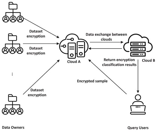 In this paper, our privacy-preserving KNN classification system involves two non-colluding clouds, data owners, and query users, as shown in Figure 1.