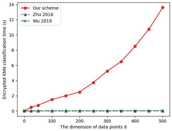 Figure 6. Average encrypted KNN classification time (s) vs. d [18,19].