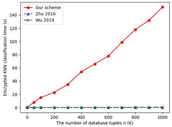 Figure 7. Average encrypted KNN classification time (s) vs. n [18,19].