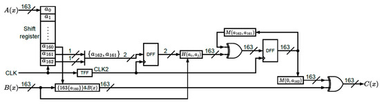 The existing work on modular multipliers over binary finite fields GF(2m) can be found in [12,13,14]. In [15], a speed-oriented architecture over the finite fields GF(2163) and GF(2571) were implemented by using a balanced quadratic multiplier with high operating frequency. Li et al. [16] exploited the Karatsuba–Ofman multiplier to a scalar multiplication over the finite fields over GF(2571) and GF(2283). To minimize the number of point additions without increasing the number of point doubling, the Radix-2w arithmetic for scalar multiplication was proposed in [17]. The authors of [18] developed a new Montgomery point multiplication algorithm for large field-size ECC over GF(2571) and GF(2409) to optimize resource utilization efficiency. Recently, Zhang et al. [19] introduced a high-performance scalar multiplication architecture over binary fields. A low-latency window (LLW) algorithm was presented for hardware implementation to enhance security, as was an enhanced comb method for point addition and point doubling. The above methods in [15,16,17,18,19] transformed the process of scalar multiplication from an affine coordinate system to a projective coordinate system. These designs were implemented and verified on the FPGA boards.