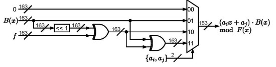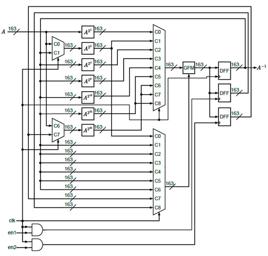 The circuit for inverse operation over GF(2163) is shown in Figure 5. The GFM is the Galois field multiplication unit and the input Ci in the multiplexer means the ith cycle.