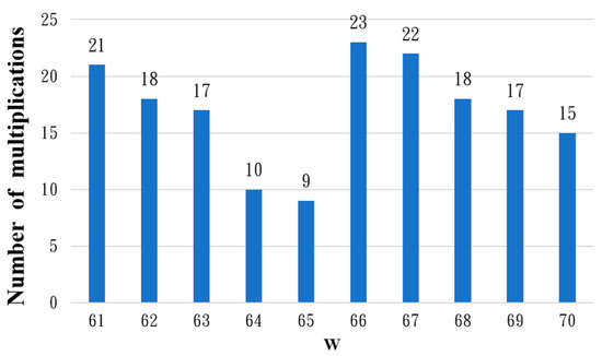 The original Fermat’s little theorem for the inverse element operation needs to go through 162 cycles of power operation and 161 cycles of multiplication operation. The main purpose of the above simplification process is to reduce the number of multiplication operations, but there is also a need to increase the number of different power operations. We investigate the number of multiplications for the inverse operation on the field GF(2163) for various . The results are depicted in Figure 4 for to .