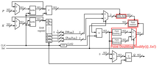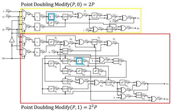 The proposed architecture of two-time point doubling is presented in Figure 6. The yellow block is used to perform one-time point doubling and the red block is for computing two-time point doubling.