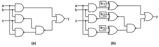 Let us consider Figure 2a representing an original circuit, which consists of three inputs and an output. It comprises five gates. On the other hand, Figure 2b shows the same circuit locked with RLL-⊕ using a 3-bit locking key. This variant has three additional XOR and XNOR key gates. At least one of the inputs of each key gate is driven by a wire from the original design, while the other input is driven by a locking key bit. The new locked circuit will only generate the correct output when activated using the correct locking key. For instance, consider Figure 2b again: if the locking key value of 110 is loaded into memory, the correct output for all input patterns (e.g., for input 000) is produced because all key gates will function as buffers. However, if an incorrect key value is used, certain key gates will function as inverters, resulting in errors in the circuit’s output. For example, when the locking key 010 and the input 000 are applied, the key gate will behave as an inverter, leading to an incorrect output .