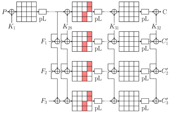 A physical disturbance represented by a fault f is injected into the circuit while it is being used for the differential fault analysis (DFA). Generally speaking, an attack can include several fault injections, i.e., repeatedly utilizing the cryptographic circuit for encryption with faults The behavior of the circuit under fault is given by . The adversary might not be completely aware of or in control of the fault injection’s effect in most situations. Thus, it is unknown what intermediate values are impacted. With the same inputs, p and , the adversary records the ciphertext C generated by the fault-free circuit and the faulty ciphertexts generated by the same circuit, upon injection of the corresponding faults, The cryptographic key is then recovered by solving the equation