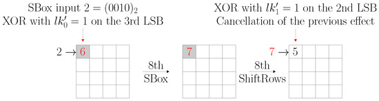 We analyzed the gate-level netlist of an LED implementation that was logic locked using an 80-bit RLL-∧ locking key . Our analysis led us to identify five locking key bits that affect the operation of round 29 of LED. Suppose an adversary can control the locking key bits as primary inputs of the circuit. It implies they can easily choose a specific incorrect locking key that flips the five locking key bits mentioned above. In our experiment, we performed one correct encryption and two incorrect encryptions using the correct locking key and two incorrect locking keys and , respectively. Finally, we solved Equation (4) (a special case of Equation (3)) in order to obtain the cryptographic key k.