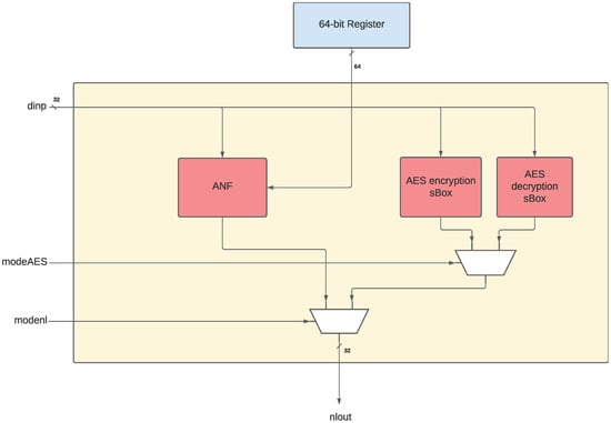 The changes to the NLU require some new input signals to control the execution and results of the sub-units. Therefore, in addition to the mode signal, a ‘modenl’ signal is introduced, which determines if the non-linear module uses the ANF or the AES sub-unit. The ‘modeAES’ signal is further introduced to determine the encryption or decryption mode of the AES sBox module in particular.