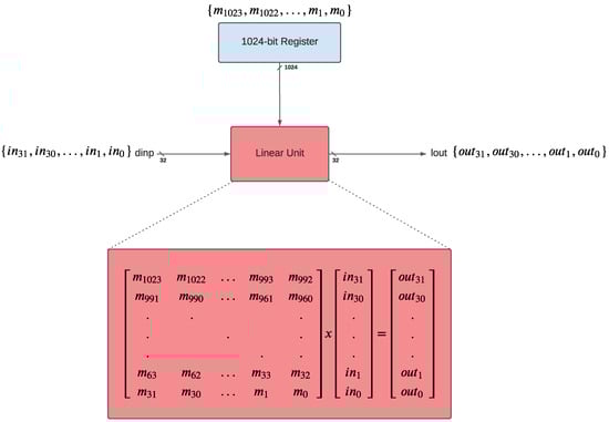 The linear unit of the NLU-V is also very similar to its counterpart in the original NLU. Because the input is now a 32-bit vector instead of an 8-bit vector, the multiplication requires a 32 × 32-bit matrix. Hence, for the new linear unit, instead of a 64-bit configuration register, a 1024-bit register is needed to store the matrix. Other approaches, such as using multiple configuration registers, executing the multiplication in multiple cycles, or reducing the configuration register size and adding more circuitry, which is all controlled by additional instructions and signals, resulted in not being beneficial or feasible. While requiring significantly more area in terms of the register, the approach of increasing the configuration register size to 1024 bits saves additional circuitry and lines of code when implementing ciphers, and hence execution time, by skipping the complex management of loading multiple registers, saving intermediary results, or handling multiple cycles. Therefore, using a 1024-bit configuration register for the linear unit, which is the simpler and probably more efficient approach, is chosen. The new design of the linear unit is presented in Figure 3. The FIFO registers are not affected by any changes and therefore are kept as they are, as can be seen in Figure 4, where ‘xlo’ and ‘rl’ correspond to the input and output, respectively (see Figure 1).