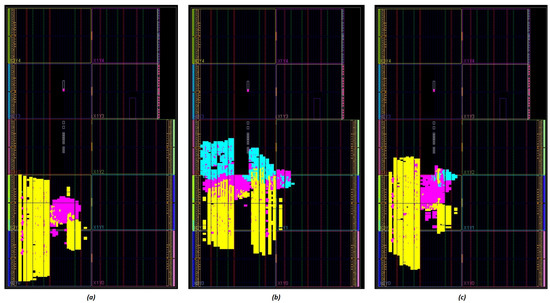 FPGA layout: (a) Icicle-only, (b) Icicle + NLU-V, and (c) Icicle + NLU-V w/out linear unit (yellow: icicle32, magenta: rv32, and cyan: nlunit32).