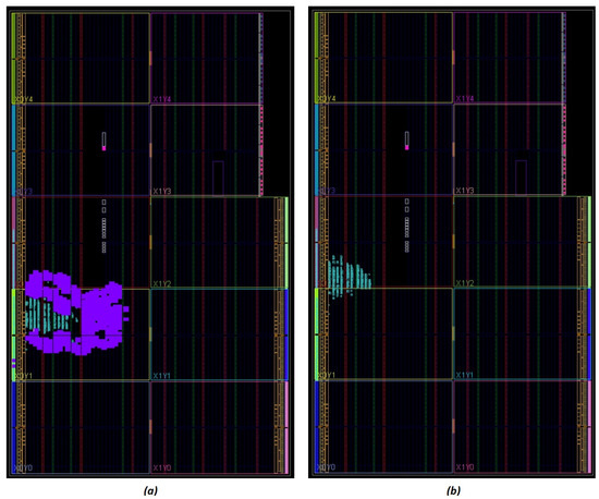 FPGA layout NLU-V (a) with linear unit, and (b) without linear unit (purple: linear unit).