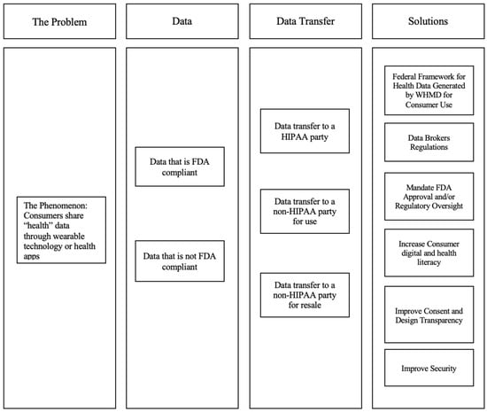 The industry of data brokers operates with minimal oversight and regulatory control, lacking federal legislation in the United States. Today, with the increasing integration of AI in business operations, there is a pressing need for enhanced policies and regulations governing marketing data [51]. While some states, such as Vermont and California, have taken steps to regulate data brokers, including measures like mandatory registration with the Secretary of State, disclosure of activities, consumer opt-out options, and stricter oversight of data breaches [52], it is imperative that similar initiatives be adopted across all states to ensure comprehensive protection and accountability. Concerns about health data related to reproductive rights emerged in the wake of the Supreme Court of the United States’ decision to overturn Roe v. Wade. Many wearables and health apps collect data on women’s menstrual cycles and fertility, raising concerns about privacy and the potential misuse of this sensitive information [53]. The concerns are driven by the fear that personal data collected from wearables and health apps, among others, could be used to penalize individuals seeking or considering getting an abortion in states where it is illegal given their current condition [54]. These concerns have been vocalized among privacy advocates, asking users of menstrual apps to delete their data and uninstall the apps [54]. The main challenges with menstrual and health apps are the intimacy of the health data being collected by a technology not considered to be health-related [55]. Apps, like Flo, a menstrual -tracking app, ask users to disclose their symptoms as well as their mood and emotional well-being [56]. All these data are pieced together to create a “user-friendly” and tailored experience by providing personalized recommendations and tracking of the user’s health. Flo, or any other app or WHMD, requires users to accept the terms and conditions to be able to access these “free services”, in exchange, some of the consumer data will be shared with other third parties.