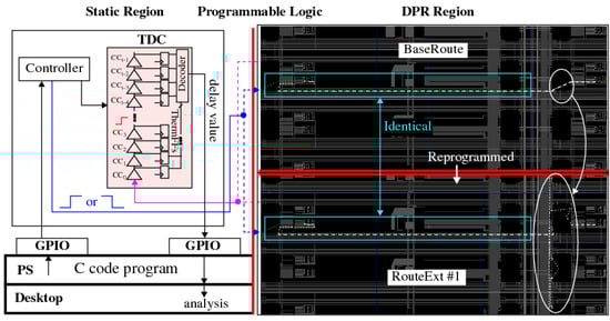 A block diagram showing the system architecture implemented on the Xilinx Zynq 7010 device is given in Figure 1. The PL component shown along the top consists of two regions: a static region (SR) on the left and a dynamic partial reconfiguration (DPR) region on the right. The SR region incorporates a set of state machines and a time-to-digital converter (TDC), as well as a register interface, labeled GPIO for general purpose input/output, to the processor system component of the SoC. The controller and TDC are capable of measuring path delays at a resolution of ∼18 ps in single-shot mode, and up to a total path length of ∼25 nanoseconds [12]. In our experiments, the paths are measured 16 times and averaged to reduce measurement noise in the single-shot measurements.