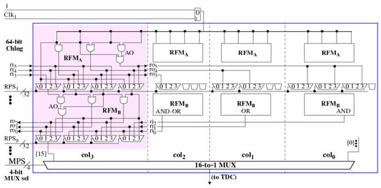 The second, tool-generated design utilizes two stacked modules from the SiRF PUF called the reconvergent-fan-out module (RFM) [13]. A block diagram of the RFM is shown in Figure 2. The module consists of two rows of 4-to-1 MUXs separated by AND, OR, and AND-OR (AO) gates (the experimental design inserts two more rows identical to those shown). The select inputs to the MUXs are controlled by the row-path-select (RPS) inputs on the left. The same gate configuration is repeated across four columns, through , with the logic gate outputs distributed across all four columns using rotate input and output, and , wires. Rising and falling transitions are introduced by a Launch FF shown along the top of the figure, which fans out to the logic gate inputs into each of columns. A 16-to-1 MUX, shown along the bottom of the figure, is used to select a path to be timed by the TDC. The design with two stacked RFM modules possesses 131,072 distinct paths, of which 8192 are testable with rising and falling transitions using 132 bit challenges.